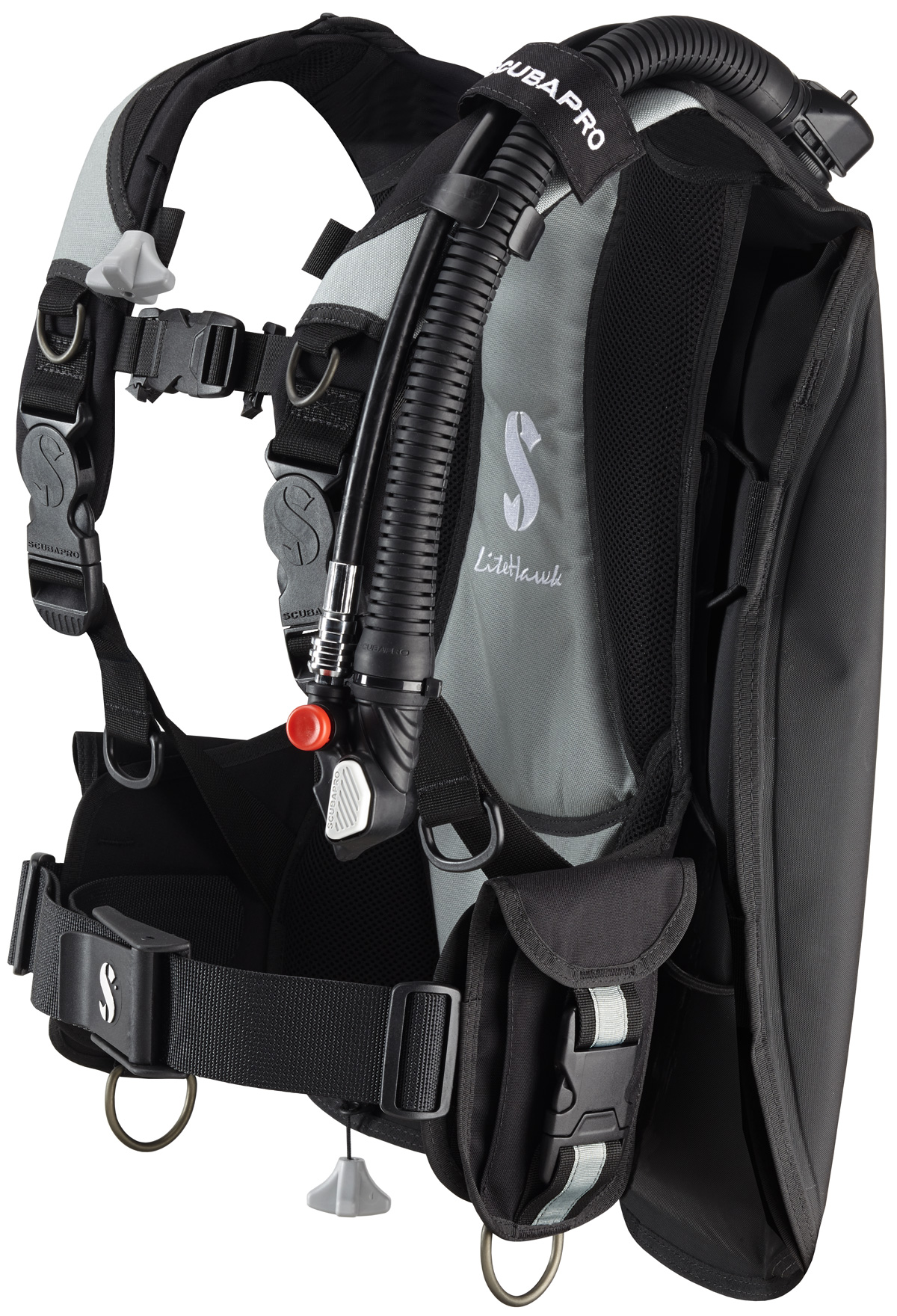 The LITEHAWK is the ultimate back-flotation travel BCD. Its lightweight, ultra-slimmed-down design and flexible backpack lays flat and compact for packing. The belt-style waist strap with nylon buckle can be cinched up snug, and quick-release rotating shoulder buckles let you route the straps under your arms for a custom fit that’s also stable at depth. The BCD carries no inherent buoyancy so only minimal ballast weight is required. Two basic accessory pockets are included, and four aluminum D-rings provide convenient clip-on points for additional gear. It’s a streamlined package that is well-suited for both tropical and temperate water diving.